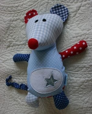 Dit muisje is ongeveer 30 cm. lang. Hij is gemaakt van verschillende donker- en lichtblauwe en een rode stof. Het witte deel op de buik en de neus zijn van vilt. In de staart zit een elastiek, zodat ie leuk terugveert als je eraan trekt en loslaat.