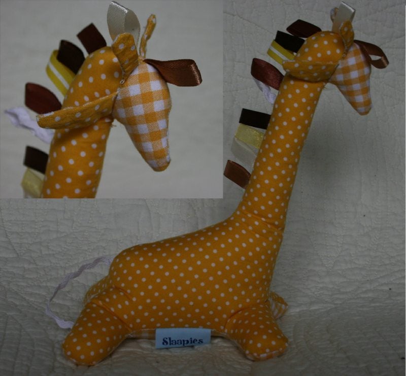 Deze giraffe is ongeveer 20 cm. lang. Geel lijfje, aan de achterkant een wit staartje. Op z'n lange nek zitten lintjes.