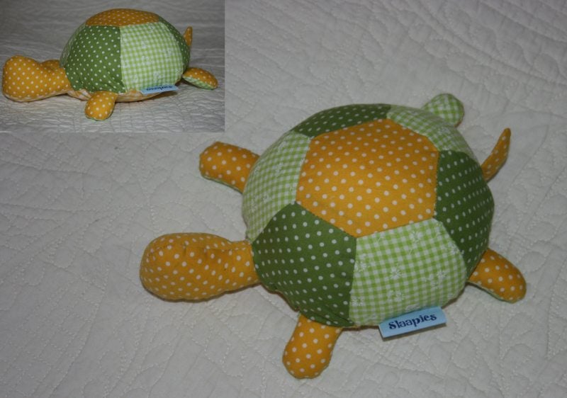 Deze schildpad is ongeveer 25 cm. lang. Geel-groen lijfje, aan de achterkant een staartje.
