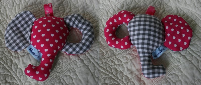Deze rammelaar is ongeveer 15 cm. Het open oor past goed in een kinderhandje. Het andere oor knispert.